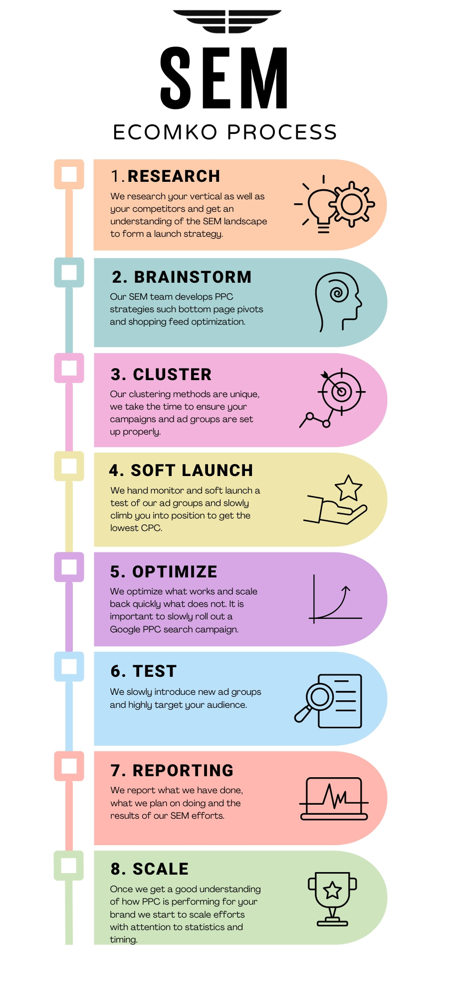 Search engine marketing includes ecomko managing your SEO, PPC, as well as Google shopping feeds.