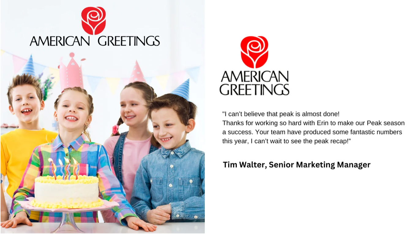 "I can’t believe that peak is almost done! Thanks for working so hard with Erin to make our Peak season a success. The two of you have produced some fantastic numbers this year, I can’t wait to see the peak recap!"